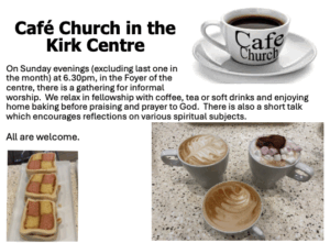 On Sunday evenings (excluding the last one in the month) there is an informal service in the Kirk Centre Cafe area.