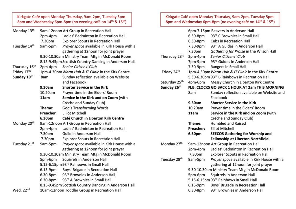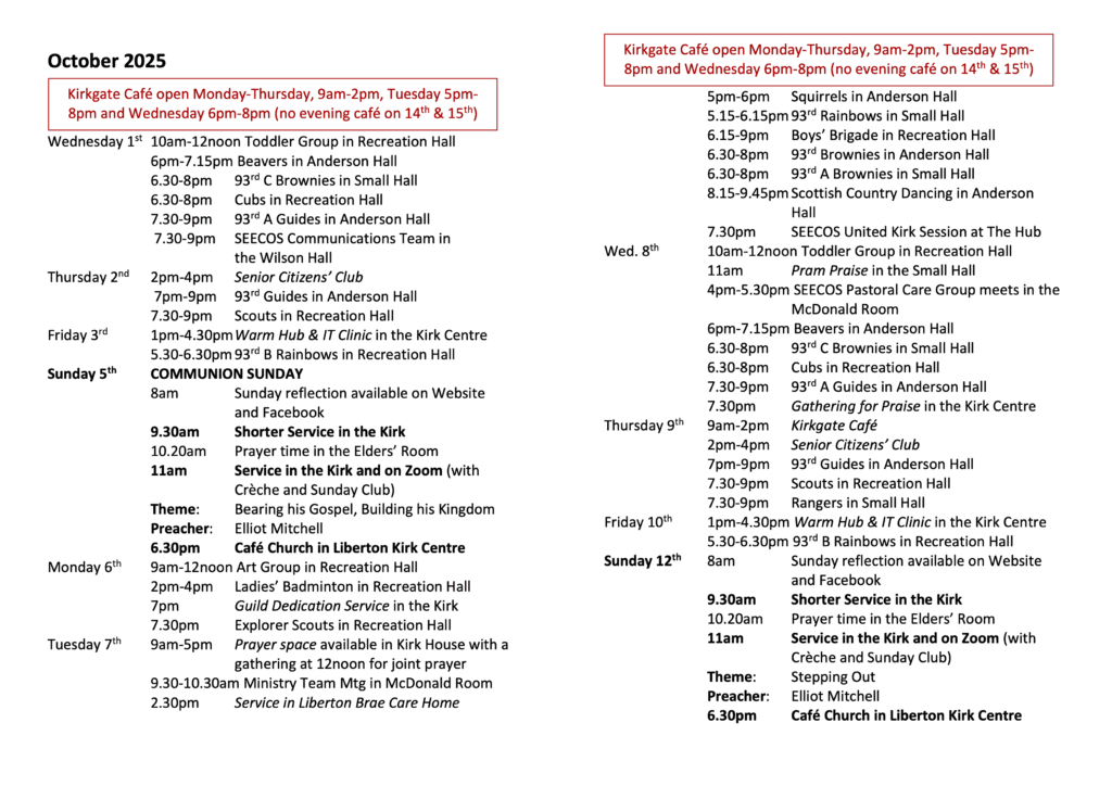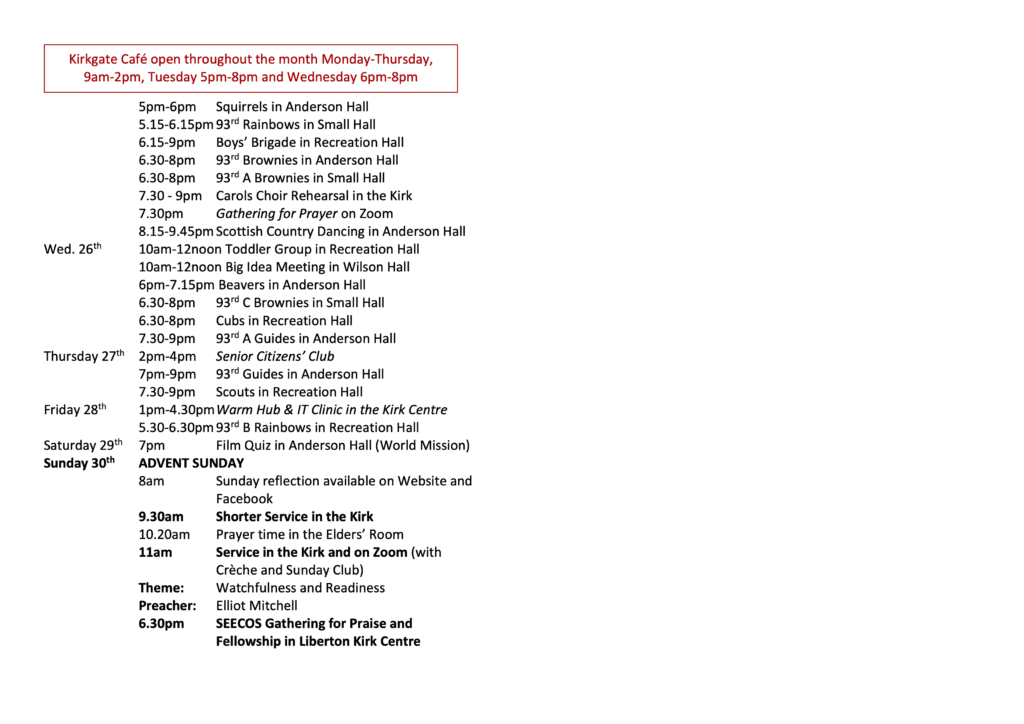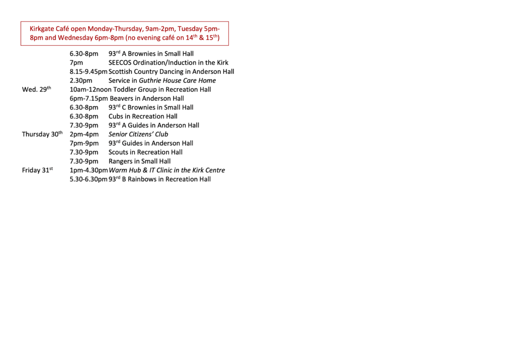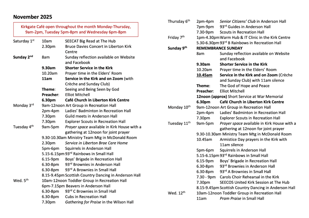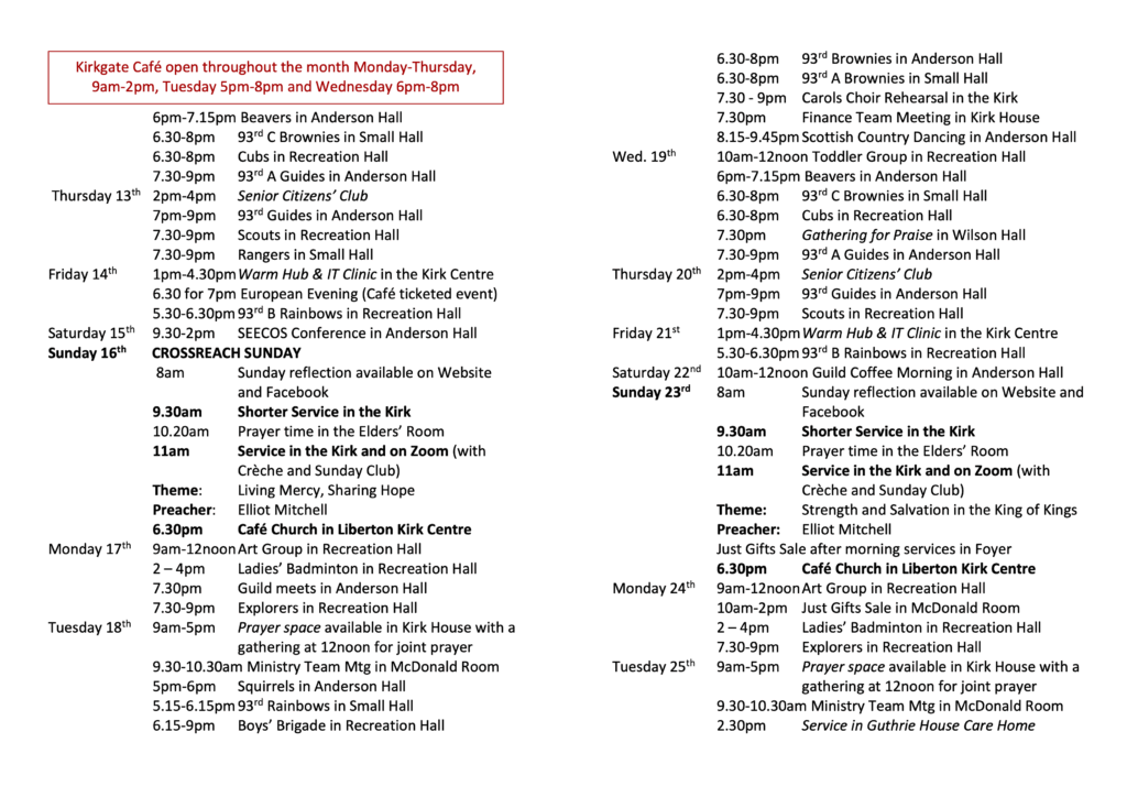 Services at 9.30am (shorter service) and 11am (service in the Kirk and on Zoom, with creche and Sunday club).
