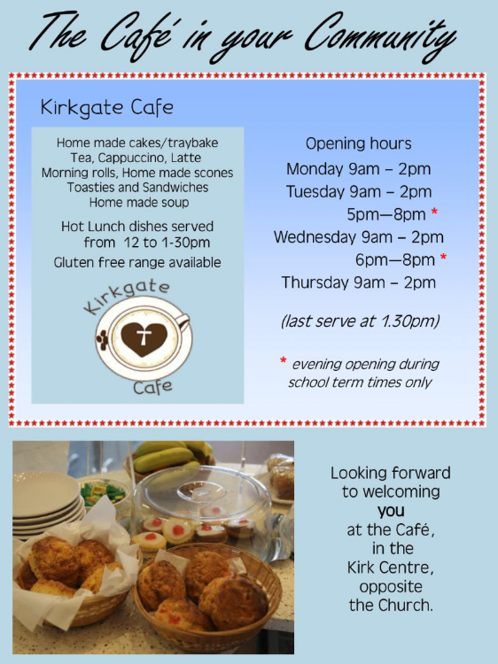 Kirkgate café is a community café staffed by a café manager and volunteers from local churches and within the community. The café is a nice space to meet family and friends for a cuppa and some homemade baking. Scones are made fresh daily and taste delicious, but you do have to be in early to get some as they sell out fast. During lunch we serve filled rolls, sandwiches and toasties. Our specials are a variety of homemade soup, filling mains and delicious desserts all made in the café kitchen. We can cater for most dietary needs – all you need to do is inform the volunteers at the counter.