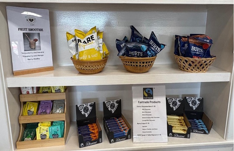 Within Kirkgate café we sell some fairtrade products such as Burt crisps, Divine chocolate and flavoured cartons of milk. These are located on a shelf next to the counter.